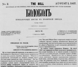 | Keywords: Kolokol newspaper 1857.jpg en Russian newspaper Kolokol The Bell 1857 second edition ru Пе вая ст аница газеты Ге цена и Ога ёва Колокол 2 Вольная усская типог афия Вто ое издание http //www rubricon com/showbigimg asp id 291703157 PD-old-100 Kolokol 1 August Newspapers of Russia 1857 |