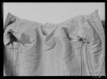 Keywords: Kolt, Karl XI - Livrustkammaren - 44557.tif LSH artwork sv Klänning av purpurfärgad gyllenduk med bårder av silver och guldbroderi silverblommor l lövverk av guld Höjd från axel och ned 95 cm Lös ståndkrage höjd fram 4 5 cm bak 3 cm Klänningen består av ett markerat 30 cm långt liv med 6 små skörtflikar varav de 2 främre gå i ett med framstycket Kjolen som börjar framtill i midjan är här 64 5 cm lång och bak 69 cm Den lösa ståndkragen är fastknäppt med 4 knappar fram bak och en på varje axel av trä Ursprungligen knäpptes kragen framtill med 2 knappar men den ena har fallit bort På kragen finnas 5 öglor för fastsättning Kjolen är i nederkanten broderad med en 9 5 cm bred bård mitt fram äro 2 sådana bårder broderade vertikalt från midjan och ner till kantbården Kjolens omkrets nertill är 237 cm Kjolen är sydd av 5 st 45 5 cm breda våder synlig vidd 2 våder stöta mot varandra mitt fram Mitt bak har kjolen ett 25 cm långt sprund från midjan en våd har sprättats upp i mitten I sidsömmarna ha 2 fickor med vardera 13 cm långt sprund passats in underkanten av ficksäcken sitter 34 5 cm från kjolens nederkant <br/>Livet har broderats med smalare bårder; fram c a 5 5 cm bred med markerad mittrad samt c a 2 8 cm breda bårder markerande falsk sidsöm från axeln och ner så att avslutningen bildas i de 2 främsta skörten Livet snöres samman baktill med 16 snörhål 26 cm Under midjeskörten löper runt hela midjan bandrosetter silverband med rosa inslag bildande 2 öglor och 2 band tampar i varje grupp Bandöglorna äro c a 12 cm långa varje ögla 6 x 12 t 72 cm Inalles är det 46 rosetter som alltså dragit en ungefärlig längd band av 33 12 meter Den flätade snodd av guld och silvertråd som snör samman livet i ryggen är 102 cm lång och i ena änden finns den urspr 2 cm lång doppskon kvar <br/>De 2 korta ärmarna äro framtill öppna längd fram 18 5 cm De ha utefter de öppna kanterna vertikalt broderade bårder som dräkten i övrigt 7 st rosettgrupper äro fastsydda nertill på varje ärm Vid ärmarnas bakre söm äro 2 hängband Flügelärmar fastsatta De äro 56 57 cm långa resp V och H och 9 6 cm breda De äro broderade på utsidan såsom bårderna i övr och på undersidan fodrade med gyllenduken 8 5 cm från nederkanten har 3 grupper bandrosetter öglorna äro nu c a 12 cm långa fastsatts Hänghandens främre sida börjar vid axelsömmen Framsidan är något längre än den bakre då sömmen är något sned Flügelärmarna äro en rest från det spanska dräkt modet som eg upphör omkr 1625 Dessa kunde bara ifrågakomma när man hade styvt snörliv <br/>Klänningen är helt fodrad med purpurfärgad nu blekt taft Troligen har samma tyg begagnats som grund för de broderade partierna Fodrets vådbredd är 105 cm 62 varptr x 44 insltr/cm2 Skörtflikarna äro fodrade med taft C a 1 95 2 cm under skört flikarnas fästsöm vid livet ha bandrosetterna sytts fast 26 bandgrupper runt midjan något ojämnt placerade Under det V midjeskörtet baktill sitter en knapp trol placerad för värjgehängets skull Den sitter cm från midjan och 6 5 cm från sömmen mitt baktill Knapparna äro små halvklotformiga träknappar med ett hål tvärs igenom klädda med silver och guldtråd Diam Höjd<br/>Å kjolens mittvåd baktill har man inte brytt sig om att öka i något stycke i midjan utan nöjt sig med den 68 cm långa våden och blott låtit underfodret gå ner i livet och detta sitter bart ett stycke under skörtflikarna I midjan under livets nederkant har men till foder begagnat samma ljusare tyg som begagnats till underlag på de broderade partierna som alltså aldrig sytts genom brokaden I midjan mitt bak under snörningen knäppes livet med en urspr hyska och en ny hake I midjan är foderskarven 3 5 5 5 cm bred inre midjemått 51 cm Livet är styvt genom foder av kanfas och fiskben <br/>Guldbrokaden har en vådbredd av c a 51 cm Den är vävd med inslag av guldtrådar guldlan spunna över gult silke och silvertrådar silverlan spunna över vitt silke samt platta silverlan och varp av purpurfärgat otvinnat silke Mönsterrapport höjd 6 cm bredd 4 cm mönster blommor av silver bladverk av guld Sidenbanden äro 14 mm breda och vävda av vitt silke smala silverlansomspunna trådar och smala platta silverlan samt rosa silkestrådar i varpen; glest inslag av smala silveromspunna trådar 14 insltr/cm original caption Karl XI s kungahyllning ca 1660 size mm 950 från axel LRK Karl XI av Sverige Kungligt klädd 1987-1989 Sweden - A Royal Treasury 1988-1989 Kunglig barnkammare 1995 Modelejon 2002 Sweden and Europe 1632-1792 2003-2004 Dödens teater 2015 Livrustkammaren Ryssland och Sverige under 1600-talet Från Karl XI s ungdom place of origin original filename LN_B14675_017555 67904 inventory number LRK 31311 44557 CC0 Kolt Karl XI - Livrustkammaren - 44557-negative tif <gallery caption Different images of same object > File Karl XI av Sveriges kolt från 1660 cirka - Livrustkammaren - 64523 tif File Kolt ägd av Karl XI tygdetaljer - Livrustkammaren - 13803 tif File Karl XIs barnkläder från 1660 - Livrustkammaren - 55962 tif File Ceremoniell barndräkt buren av Karl XI - Livrustkammaren - 13795 tif </gallery> Sami clothing Media contributed by LSH unmatched event Media contributed by LSH 2014-11