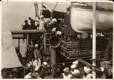 Keywords: monochrome DESCRIPTION: Sikh people aboard ship, 'Komagata Maru' - Gurdit Singh with white beard and light coloured suit VPL Accession Number: 136 Date: May 23 - July 23, 1914 Photographer/Studio: Canadian Photo Company SUBJECTS: Komagata Maru Incident, 1914, East Indians, East Indian Canadians, Sikhs, Sikh Canadians, Government relations with ethnic groups, Ethnic groups, Emigration and immigration, Ships, Race discrimination, Race relations Person: Singh, Gurdit, 1860-1954 Location: British Columbia - Vancouver - Burrard Inlet More information on our historical photograph collection: www.vpl.ca/historicalphotos DESCRIPTION: Sikh people aboard ship, 'Komagata Maru' - Gurdit Singh with white beard and light coloured suit VPL Accession Number: 136 Date: May 23 - July 23, 1914 Photographer/Studio: Canadian Photo Company SUBJECTS: Komagata Maru Incident, 1914, East Indians, East Indian Canadians, Sikhs, Sikh Canadians, Government relations with ethnic groups, Ethnic groups, Emigration and immigration, Ships, Race discrimination, Race relations Person: Singh, Gurdit, 1860-1954 Location: British Columbia - Vancouver - Burrard Inlet More information on our historical photograph collection: www.vpl.ca/historicalphotos |