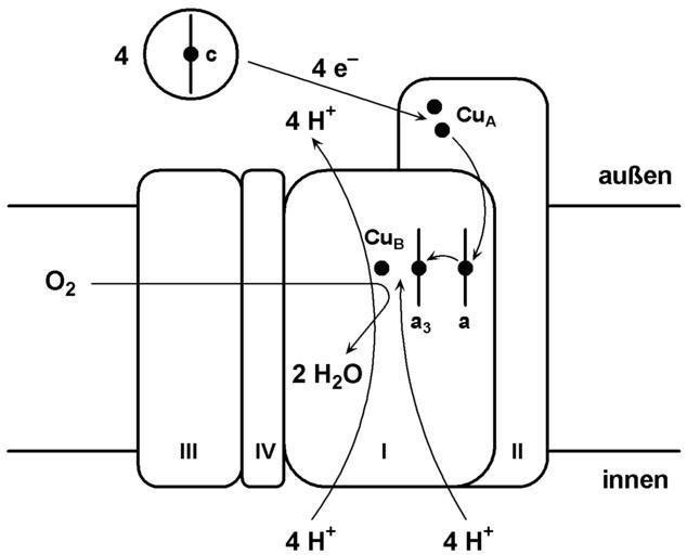 Keywords: Komplex IV.png Schematische Darstellung des Komplex IV der Atmungskette schematic representation of Complex IV of the electron transport chain own 1999-03-15 Klaus Hoffmeier Biochemistry diagrams Oxidative phosphorylation Cytochrome c oxidase |