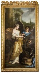 Keywords: Konung Karl XIs uppfostran. Allegori (David Klöcker Ehrenstrahl) - Nationalmuseum - 174860.tif Kungens skyddsängel visar ödets gudinna Lachesis symboler för skilda dyg- der vilka skola nystas in i livstråden Dessa symboler utgöras av tre böcker religion lagskip- ning och historia Minervas kask och sköld vishet och förstånd Apollos lyra de fria kons- terna Merkurius stav klokhet och erfarenhet svärdet och vågskålarna rätvisan harnesk fana och spjut krigskonsten och Herkules klubba tapperhet styrka och makt Vidare åter- givas lager och pamkvistar ära och triumf olivkvistar fred vallmo lugn och säkerhet och ax rikedom Gudinnan Lachesis som nystar upp konungens gyllene livstråd runt olika sym- boler är framställd i helfigur face höger och iklädd vit urringad dräkt samt gul mantel Konungens skyddsängel står bakom symbolerna och håller upp några av dessa Hon är synlig i bröstbild face vänster och iklädd blå dräkt samt lila mantel I bakgrunden till vänster en ref- flad kolonn och ett rundtempel till höger ett klassiskt sommarlandskap header Kungens skyddsängel visar ödets gudinna Lachesis symboler för skilda dyg- der vilka skola nystas in i livstråden Dessa symboler utgöras av tre böcker religion lagskip- ning och historia Minervas kask och sköld vishet och förstånd Apollos lyra de fria kons- terna Merkurius stav klokhet och erfarenhet svärdet och vågskålarna rätvisan harnesk fana och spjut krigskonsten och Herkules klubba tapperhet styrka och makt Vidare åter- givas lager och pamkvistar ära och triumf olivkvistar fred vallmo lugn och säkerhet och ax rikedom Gudinnan Lachesis som nystar upp konungens gyllene livstråd runt olika sym- boler är framställd i helfigur face höger och iklädd vit urringad dräkt samt gul mantel Konungens skyddsängel står bakom symbolerna och håller upp några av dessa Hon är synlig i bröstbild face vänster och iklädd blå dräkt samt lila mantel I bakgrunden till vänster en ref- flad kolonn och ett rundtempel till höger ett klassiskt sommarlandskap 1668 Oil on canvas Olja på duk Size cm 135 268 Institution Nationalmuseum Stockholm Drottningholms slott Dav Klöker fecit Ano 1668 enl 1867 års inventarium accession number 174860 NMDrh 27 place of creation Q34 Linn Ahlgren / Nationalmuseum Nationalmuseum Stockholm cooperation project Licensed-PD-Art PD-old-auto PD-Nationalmuseum_Stockholm 1698 Media contributed by Nationalmuseum Stockholm 2016-10 Media contributed by Nationalmuseum Stockholm connect to wikidata item Paintings in the Nationalmuseum Stockholm Paintings at Royal Domain of Drottningholm David Klöcker Ehrenstrahl |
