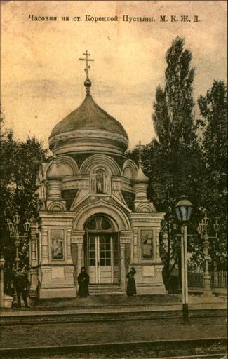 Keywords: Korennaya Pustyn (Svoboda) Train Station Chapel.jpg en Chapel at Korennaya pustyn' Svoboda from 1918 Train Station in the begining of XX century ru Часовня на станции Ко енная Пустынь Свобода с 1918 в начале XX века Old postcard до еволюционная отк ытка digital copy was downloaded from http //www parovoz com/newgallery/ ID 78062 LNG RU picture Издание Forlag Hier Theodosius Granbergs Konstinustri-Aktiebolag Stockholm 1902 PD-old Chapels in Kursk Oblast Korennaja pustyn' Historical train stations in Kursk Oblast Postcards of Kursk Governorate
