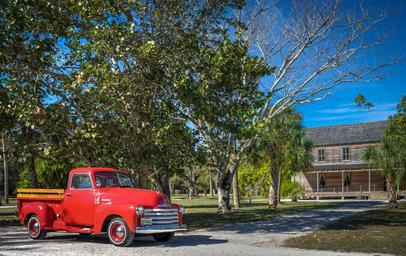 Keywords: koreshan state park cult florida yellow house 1900's empty home abandoned grass historic porch tropics wooden windows red 47 chevy architecture sky landscape blue old structure nature