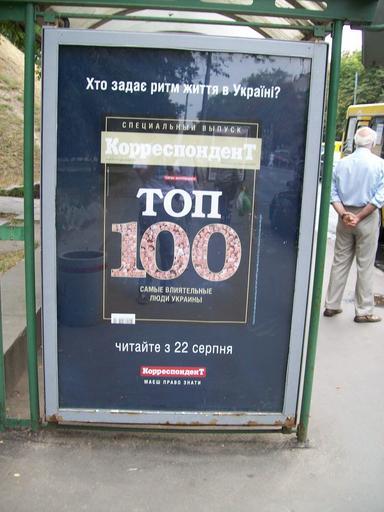 | Keywords: Korrespondent top 100 2008.JPG en Since 2003 Ukrainian magazine Korrespondent ranks the 100 most influental individuals who significantly influenced economic business political or societal development in Ukraine during the year Street advertisement in Kyiv for this years top 100 summer 2008 Own Mariah-Yulia 2008-08 Advertisements in Kiev Illuminated advertisements |