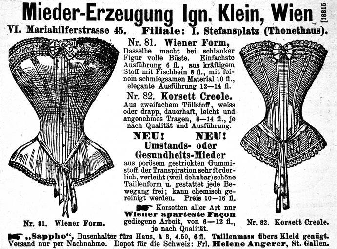 Keywords: KorsettReform.jpg en Promotion of a corset manufacturer from 1891 On the left is a contemporary corset made ‹ ‹of heavy fabric and stiffening of whalebone On the right to see a corset which were offered as health care reform or maternity corset These were determined only at the waist otherwise they were flexible and offered a certain freedom of movement The reinforcement was usually made of flattened steel or brass springs de Werbung eines Korsettherstellers aus dem Jahre 1891 Auf der linken Seite ist ein zeitgenössisches Korsett aus kräftigem Stoff und mit Versteifung aus Fischbein Rechts ist ein Korsett zu sehen welches als Gesundheits- Reform- oder Schwangerschaftskorsett angeboten wurden Diese waren nur in der Taille fest ansonsten waren sie dehnbar und boten eine gewisse Bewegungsfreiheit Die Versteifung war meist aus plattgedrückten Stahl- oder Messingfedern Werbetext Mieder-Erzeugung Ign Klein Wien VI Mariahilferstrasse 45 Filiale I Stefansplatz Thonethaus Nr 81 Wiener Form Dasselbe macht bei schlanker Figur volle Brüste Einfachste Ausführung 6 fl mit feinem schmiegsamen Material 10 fl elegante Ausführung 12-14 fl Nr 82 korsett Creole Aus zweifachem Tüllstoff weiß oder drapp dauerhaft leicht und angenehmes Tragen 8-14 fl je nach Qualität und Ausführung NEU NEU Umstands- oder Gesundheits-Mieder aus porösem gestrickten Gummistoff der Transpiration sehr förderlich verleiht weil dehnbar schöne Taillenform u gestattet jede Bewegung frei; kann chemisch gereinigt werden Preis 10-16 fl Korsetten aller Art nur Wiener aparteste Facon gediegene Arbeit von 6-12 fl je nach Qualität Sappho Busenhalter fürs Haus á 3 4 50 6 fl Taillenmass übers Kleid genügt Versand nur per Nachnahme Depot für die Schweiz Frl helene Angerer St Gallen Fürs Haus Praktisches Wochenblatt für alle Hausfrauen 07 03 1891 Clara von Studnitz Mieder-Erzeugung Ign Klein Wien 1891-03-07 Corset advertisements Maternity corsets 1891 advertisements Fashion in 1891 PD-old |