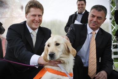 Keywords: Krashtavane ku4eta.jpg bg Главният изпълнителенди екто на -Тел Анд еас айе хофе и министъ а на об азованието младежта и науката Се гей Игнатов к ъщават кучета-водачи own Mobiltel Unidentified people Golden Retriever Three people Mtel