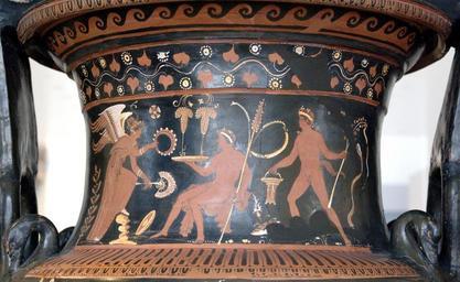 Keywords: Krater naiskos Antikensammlung Berlin 1984.41 neck.jpg Dareios-Maler Darius Painter Grabszene Zechgelage des Todes B-Seites Hals des »Phrixos-Kraters« ein apulischer rotfiguriger Volutenkrater um 340 v Chr Funerary scene dead's libation Side B's neck of the Phrixos krater an Apulian red-figure volute-krater ca 340 BC Scène funéraire libation du mort Col de la face B du « cratère de Phrixos » un cratère à volutes apulien à figures rouges v 340 av J -C H 102 cm Museum Altes Museum Kompartiment XXIII Tarent case 7 Vasen aus einem Grab in Apulien object history credit line accession number Inv 1984 41 User Bibi Saint-Pol own work 2008 other versions <gallery> Image Krater naiskos Antikensammlung Berlin 1984 41 jpg Detail of side B Image Unteritalischer Grabfund rotfiguriger Vasen 5 JPG Full side B Image Krater by the Darius Painter Antikensammlung Berlin 1984 41 jpg Side A </gallery> Naiskos vases Volute kraters Darius Painter Red-figure pottery in the Antikensammlung Berlin Altes Museum Berlin - Kompartiment 23 340s BC Libation in ancient Greece and Rome Cultic practices in ancient Greek pottery |