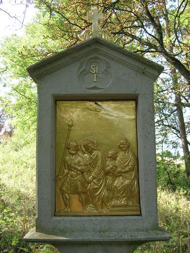 Keywords: Kreuzweg Frauenberg (Eichstätt) -01.jpg Frauenbergkapelle 14 Bildstöcke ehemals mit Gusseisenreliefs 1856; in ab 1875 angepflanzter Kastanienallee own WaldiWuff 2012-08-15 Kreuzweg Frauenberg Eichstätt 01 Station 1 Jesus is condemned to death Germany Bavaria Eichstätt Cc-zero |