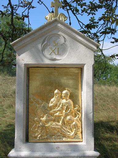 Keywords: Kreuzweg Frauenberg (Eichstätt) -11.jpg Frauenbergkapelle 14 Bildstöcke ehemals mit Gusseisenreliefs 1856; in ab 1875 angepflanzter Kastanienallee own WaldiWuff 2012-08-15 Kreuzweg Frauenberg Eichstätt 11 Station 11 Crucifixion Jesus is nailed to the cross Germany Bavaria Eichstätt Cc-zero |