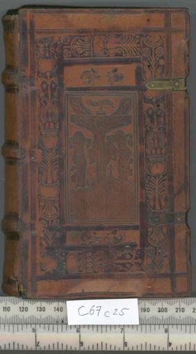 Keywords: Krieg Buechlin des Friedes - Upper cover (c67c25).jpg Style Biblical scene Floral Panel design Religious miscellaneous; Caption Upper cover; Colour Brown; Edge Ink ms note exhibition history Decorative Technique Tooled in blind; Cover Material Calf Remnants of 2 pairs of clasps Ms title written on fore edge Macchi states; Bound 1550-1600 Simmern Palatine Germany bound by V S binder as the central panel stamp and surrounding Aldus fleurons suggest I Schunke Die Einbaende der Palatina p XXVI Simmern is located in the Palatinate Region in which several binders who used cyphers were to be found probably followers of this fashion spread out in Cologne The Vatican Library keeps a German Renaissance binding provided with the same panel stamp I Schunke Die Einbaende der Palatina p 45 p XXVI shelfmark Pal IV 507 The bow behind the cross is unusual object history Text 1550; Frankfurt; Unspecified object type Cc-zero place of creation Binding Germany place of discovery Unspecified British Library image http //www bl uk/catalogues/bookbindings/LargeImage aspx RecordId 020-000004448 ImageId ImageId 41829 Copyright BL Krieg Buechlin des Friedes Uploaded with GWToolset Krieg Buechlin des Friedes - Upper cover c67c25 http //www webarchive org uk/bldatasets/bindings/6382_4 jpg Bookbinding 16th-century bookbinding British Library Bookbindings |