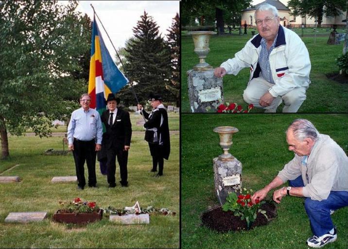 Keywords: Kristina Erlandsdotter Ridderstedt death centenary 2007.JPG en Descendants of Kristina Erlandsdotter Ridderstedt pay tribute to her at the exact same time on the 100th anniversary of her death left at the grave of her eldest son Calvin Buzz Curtis Jacob Truedson Demitz with banner held by Emil Eikner ; right at her grave Anders Bergman Hans Bäck <br>Place left Greenhill Cemetery Laramie WY; right Stora Tuna Churchyard Borlänge Sweden User EmilEikS/Template Southerly Clubs Spike Jorgensen for FamSAC 2007-06-05 Southerly Clubs Image Archives Ristesson History Graves in Sweden FamSAC Graves in Wyoming Anniversaries Stora Tuna kyrkogård Kristina Erlandsdotter Ridderstedt Laramie Wyoming Trued Family reunions Jacob Truedson Demitz National Costume of Sweden of 1778 FamSAC banner |