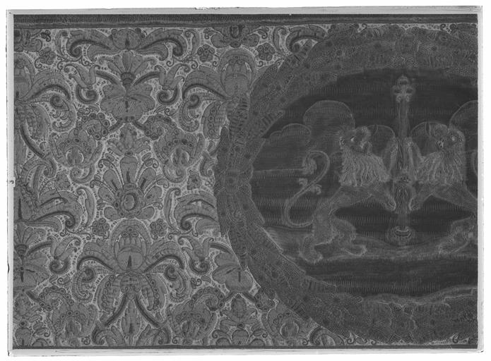 | Keywords: Kristina kröningshimlen gjord på 1640-talet i Paris av siden, linne, pärlor, guld och silver - Livrustkammaren - 70481-negative.tif LSH artwork sv Ett rektangulärt tak med fyra nedhängande fasta innerkappor och fyra lösa ytterkappor Ytterkapporna utgörs av två långa kappor l 2510 mm b 660 mm samt två kortare kappor l 1800 mm b 660 mm Taket samt kapporna är av violett purpursammet med reliefbroderi i guld och silver på silkeskärna i varierande teknik Broderiet utgörs av ett vegetativt antikiserande motiv av palmetter akantusblad och voluter Broderiet är symmetriskt utformat i räta rader Mitt på kapporna sitter ovala medaljonger diam ca 330-390 mm framställande riksregalierna i två serier Medaljongerna är broderade separat och fastsydda på kapporna Medaljongerna omges av bladkransar med lagerblad av guldtråd och silkestråd Kransarna är sammanbundna av fyra små blommor av silkestråd På kappornas nedre del sitter en bred bård av krepiner i silver och guld föreställande blommor Krepinerna skiljer sig något på inner och ytterkapporna Nedanför dessa sitter ett 20 mm brett vävt guldband med invävda lan i guld och silver lagda i kors Kapporna kantas slutligen nertill av en 130 mm lång tät frans av tvinnad guld och silvertråd Fransen är något glesare på innerkapporna på kortsidorna Ytterkapporna kantas runtom av en kortare frans av gul silkestråd 20 mm Taket är på baksidan klätt med naturfärgat linnelärft Linnelärften från taket överlappar sidokapporna med en lös kant 130 mm bred Kapporna är på baksidan klädda med röd sammet För fäste av de lösa ytterkapporna samt för fästandet av bärstängerna sitter på baksidan av innerkapporna långa knytband av naturvitt linne fastsydda i par De sitter på ett grönt vävt linneband På baksidan av ytterkapporna sitter på ett röd och gulrandigt vävt linneband hällor av naturfärgat linne 19-28 hällor på varje sidokappa Medaljongerna bär samma motiv på både inner och ytterkappor De visar riksregalierna Samtliga motiv återges av broderier i hög relief av silver och guldtråd samt med silkestråd i schattérsöm Svärdet hållet av två riddare i antikiserande rustning av guld silver och silkestråd Bakgrunden utgörs av gräsbevuxna kullar av grön silkestråd i olika nyanser samt himmel och moln av silkestråd i blått vitt och brunt Spiran hållen av två lejon stående på bakbenen Lejonens ögon är av svarta pärlor Lejonen står på gräsbeväxta kullar med en himmel av vit silkestråd och moln med kanter av silvertråd och silverlan Riksnyckeln hållen av två sjöjungfrur mot en bakgrund av himmel och hav av silkestråd i blå och vita nyanser samt med detaljer av gul silkestråd Sjöjungfrurnas långa hår är broderat med brun silkestråd på innerkappan och med gul silkestråd på ytterkappan Nyckeln är av guldtråd samt guldlan och små vita pärlor Riksäpplet skildras liggandes i en framsträckt hand föreställande Guds hand Riksäpplet är huvudsakligen av guld- och silvertråd samt silverlan och framställs mot en bakgrund av emanerande strålar Motivet omges av en inre ram av moln med konturer av guld- och silvertråd Anmärkning Till himlen hör en lös medaljong föreställande en kunglig krona uppburen av två bevingade putti med löst äpple nnr 6040 Medaljongen satt på undersidan av kröningshimlens tak Till Karl X Gustavs biläger avlägsnades kronan från taket och placerades på ryggstycket till bilägerssängen till vilken delar av himlen användes Då kröningshimlen återställdes till Karl XI s kröning 1675 återplacerade inte kronan utan förvarades bland lösa broderier i Husgerådskammaren varifrån den återlämnades 1875 De åtta bärstänger nnr 31980-31987 som hör till kröningshimlen nytillverkades till Karl XI s kröning 1675 De är runt 3000 mm höga och klädda med röd sammet dekorerade med vävda guldband och förgyllda nitar De ursprungliga bärstängerna ska dessutom ha varit dekorerade med pärlbroderier Då kröningshimlen skurits upp och senare åter sytts ihop har skarvar och infällda bitar tillkommit men det är svårt att se konturerna för sömnaden då broderierna täcker sömmarna Man kan dock på taket se att broderiet har förskjutits På innerkappan runtom medaljongen med riksnyckeln sitter en större infälld bit av ett rött sammetstyg 465x335 mm Detta beror på att denna medaljong skurits ut till Karl XI s dopsäng och senare ersatts av en ny medaljong Halva taket är mörkare i färgen broderierna dvs guld och silvertråden har oxiderat Sidokapporna var beströdda med pärlor av vilka nu endast återstår spår i form av blottade silkeskärnor På medaljongen med riksnyckeln på innerkappan sitter fortfarande ett fåtal små vita pärlor kvar Även broderierna på kapporna har oxiderat Fullt av små nålstick på medaljongerna på de ställen där det saknas silkestråd och antagligen även pärlor Vid sidan av samtliga medaljonger sitter små röda lackklumpar På riksäpplet i medaljongen på ytterkappan har sömmarna släppt i kanten På en av ytterkapporna den ytterkappan som frasmtäller spiran sitter en mindre bit av infälld sammet något rödare i färgen I den övre kanten vid sidan av medaljongen saknas en bit av broderiet Man har varit sparsam med sammetsyget som inte är täckande under medaljongerna Historik och proveniens Kröningshimlen beställdes i slutet på 1640-talet tillsammans med diverse praktfulla textilier från Paris inför drottning Kristinas kröningsceremoni Den omnämns för första gången i en korrespondens från år 1648 gällande beställningen Man vet inte med säkerhet vem brodören var men man tror att det kan ha varit en fransk pärlstickare vid namn Pierre Boucher Efter kröningen år 1650 inlämnades himlen till Husgerådskammaren och finns från år 1654 omnämnd i Husgerådskammarens inventarieförteckning Till Karl X Gustavs och Hedvig Eleonoras bröllop sprättades himl