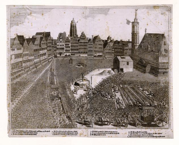 | Keywords: Kroenung Karl VI Frankfurt 1711.jpg Feierlichkeiten anlässlich der Krönung Karls VI am 22 Dez 1711 auf dem Römerberg Verrichtung der Erzämter http //cgi-host uni-marburg de/~hlgl/ortsansichten/max cgi id Frankfurt_1711_1<br />Goethemuseum Freies Deutsches Hochstift Frankfurt am Main Inv Nr III-1529 1712 Author PD-old-100 Coronation of Charles VI Holy Roman Emperor Frankfurt am Main in art Römerberg Großer und Kleiner Engel Alte Nikolaikirche Frankfurt am Main Remote views of the Kaiserdom St Bartholomäus Spire of Kaiserdom St Bartholomäus Kaiserdom St Bartholomäus in the 18th century Gerechtigkeitsbrunnen Frankfurt 1711 in Frankfurt am Main |