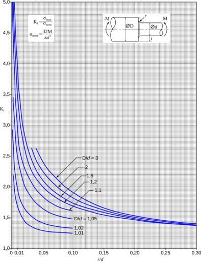 | Keywords: Kt arbre epaule flexion.svg fr Abaque de facteurs de concentration de contrainte K<sub>t</sub> dans le cas d'un arbre épaulé en flexion en Stress concentration factors K<sub>t</sub> chart for a shaft with shoulder fillet in bending 2013-04-24 10 04 28 own from Pilkey Walter D Peterson's Stress Concentration Factors 2<sup>nd</sup> ed Wiley sons 1997 ISBN 97-0-471-53849-3 p 164 Cdang inkscape cdang ; Calculation <math>\mathrm K_t \mathrm C _1 + \mathrm C _2 \alpha + \mathrm C _3 \alpha 2 + \mathrm C _4 \alpha 3</math> <math>\alpha \frac 2t \mathrm D </math> t is the fillet height t D - d /2 wikitable + Coefficient for the calculation of K<sub>t</sub> - β t/r scope col 0 1 ‰¤ β ‰¤ 2 0 scope col 2 0 ‰¤ β ‰¤ 20 - scope row C<sub>1</sub> <math>0 947 + 1 206 \sqrt \beta - 0 131 \beta</math> <math>1 232 + 0 832 \sqrt \beta - 0 008 \beta</math> - scope row C<sub>2</sub> <math>0 022 - 3 405 \sqrt \beta + 0 915 \beta</math> <math>-3 813 + 0 968 \sqrt \beta - 0 260 \beta</math> - scope row C<sub>3</sub> <math>0 869 + 1 777 \sqrt \beta - 0 555 \beta</math> <math>7 423 - 4 868 \sqrt \beta + 0 869 \beta</math> - scope row C<sub>4</sub> <math>-0 810 + 0 422 \sqrt \beta - 0 260 \beta</math> <math>-3 839 + 3 070 \sqrt \beta - 0 600 \beta</math> scilab source <source lang scilab > // // Initialisation // clear; clc; // // Fonctions // // Saisie des paramètres géométriques function A param_geo A 1 input grand diamètre D ; A 2 input petit diamètre d ; A 3 input rayon r ; endfunction // Calcul en flexion function Kt Kt_flexion Alpha Beta drapeau Beta < 2; select drapeau case t then coefs 0 947 1 206 -0 131; 0 022 -3 405 0 915; 0 869 1 777 -0 555; -0 810 0 422 -0 260; case f then coefs 1 232 0 832 -0 008; -3 813 0 968 -0 260; 7 423 -4 868 0 869; -3 839 3 070 -0 600; end C coefs 1 + coefs 2 sqrt Beta + coefs 3 Beta; polynome poly C' x c ; Kt horner polynome Alpha ; endfunction // // Programme principal // // Accueil disp Facteurs de concentration de contrainte dun arbre épaulé disp W D Pilkey Petersons Stress Concentraiton factors Wiley sons 1997 // A 1 D ; A 2 d ; A 3 r A param_geo ; t 0 5 A 1 - A 2 ; // hauteur de filet Beta t/A 3 ; // t/r Alpha 2 t/A 1 ; Kt_fl Kt_flexion Alpha Beta ; if Beta < 0 1 Beta > 20 then disp Torsion attention valeur extrapolée ; end disp 'Kt flexion '+string Kt_fl ; if Beta < 0 1 Beta > 20 then disp Attention valeur extrapolée ; end </source> cc-zero Uploaded with UploadWizard Stress concentration Bending of beams |