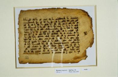 | Keywords: Kufi - D I style.jpg en Verses 105-111 of the 17th chapter of the Qur'an entitled Surat al-Isra' The Night Journey or Surat Bani Isra'il The Children of Israel The text's Kufi script is related to the D I style typical of horizontal Qur'ans produced during the 9th century LOC-calligraphy ascs 290 Unknown Calligrapher century 9 PD-Art Kufic style Qur'an manuscripts 9th century Library of Congress Arabic Persian and Ottoman calligraphy collection | ||||