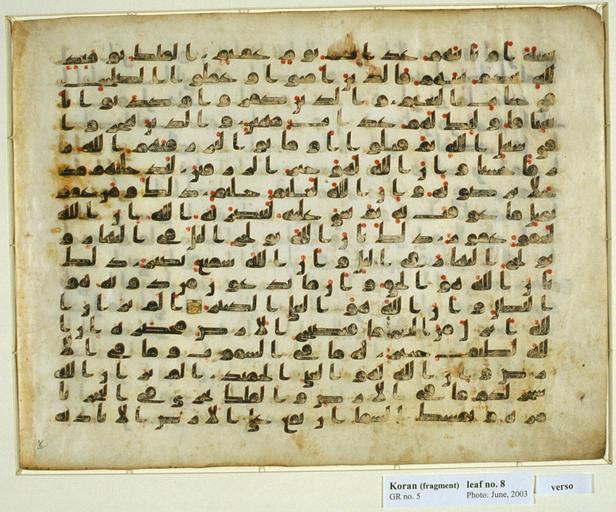 | Keywords: Kufi script (E style) - Qur'anic verses.jpg en Verses 55-74 of the 22nd chapter of the Qur'an entitled Surat al-Hajj The Pilgrimage The text is executed in Kufi script close to the E style typical of horizontal Qur'ans produced on parchment during the 9th-10th centuries LOC-calligraphy ascs 286 Unknown Calligrapher 9th-10th centuries PD-Art Kufic style Qur'an manuscripts 9th-10th century Library of Congress Arabic Persian and Ottoman calligraphy collection | ||||
