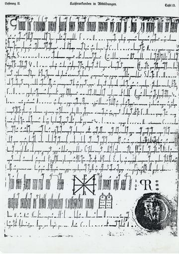 Keywords: KUIA II.13..jpg de Schenkung des Hofes Vilmar an St Mathias zu Trier D H III 309b Kaiserurkunden in Abbildungen Berlin 1880-1891 Heinrich III 1053 August 5 PD old Books documents and monograms of Henry III Holy Roman Emperor 1053 works in Europe PD-Art PD-old |