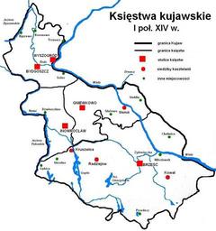 | Keywords: Kujawy księstwa dzielnicowe XIV w.jpg pl Kujawy - podział na księstwa w I połowie XIV wieku Opracowano na podstawie Guldon Zenon Podziały administracyjne Kujaw i ziemi dobrzyńskiej w XIII-XIV wieku Warszawa Poznań Państwowe Wydawnictwo Naukowe 1974 own Pit1233 2011-09 Kujawy Cc-zero |