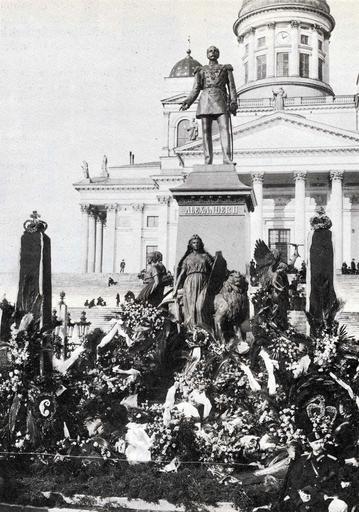 Keywords: Kukitettu Aleksanteri toisen patsas 1899.jpg en The statue of Alexander II in the Helsinki Senate Square decorated with flowers on the anniversary of the death of the czar 13 March 1899 By placing flowers there the people protested the February manifest and the sea of flowers increased daily fi Aleksanteri II n patsas Helsingin senaatintorilla kukitettuna keisarin kuoleman muistopäivänä 13 3 1899 Kukkien tuominen oli kansalaisten keino protestoida helmikuun manifestia vastaan ja kukkameri oli kasvanut päivä päivältä sv Alexander II s staty pÃ¥ senatstorget i Helsingfors prydd med blommor pÃ¥ Ã¥rsdagen av kejsarens död 13 3 1899 Genom att lägga blommor pÃ¥ den protesterade folket mot februarimanifestet och blomsterhavet växte varje dag Leo Mechelin 1839 “1914 Helsingin herra valtiollinen vaikuttaja ja Suomi-kuvan luoja Helsinki City Museum Helsinki 1989; p 22 1899-03-13 Creator Karl Emil StÃ¥hlberg PD-old Statue of Alexander II in Helsinki Karl Emil StÃ¥hlberg 1899 in Finland