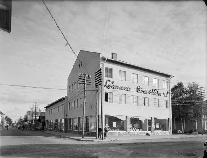Keywords: blackandwhite monochrome outdoor building architecture black and white Loimaan Osuusliikkeen keskustoimipaikka. Alkuperäinen kuvateksti: "Tällainen on Loimaan Osuusliikkeen uusi keskustoimipaikka, joka sijaitsee keskellä kauppalaa torin varrella ja pystyy varmasti pitkän aikaa säilyttämään asemansa paikkakunnan ajanmukaisinpana liiketalona." (Kuluttajain lehti 19/1950, s. 6) photographer unknown / kuvaaja tuntematon 1950 Loimaa, Varsinais-Suomi, Finland / Suomi Finnish Museum of Photography / Suomen valokuvataiteen museo Loimaan Osuusliikkeen keskustoimipaikka. Alkuperäinen kuvateksti: "Tällainen on Loimaan Osuusliikkeen uusi keskustoimipaikka, joka sijaitsee keskellä kauppalaa torin varrella ja pystyy varmasti pitkän aikaa säilyttämään asemansa paikkakunnan ajanmukaisinpana liiketalona." (Kuluttajain lehti 19/1950, s. 6) photographer unknown / kuvaaja tuntematon 1950 Loimaa, Varsinais-Suomi, Finland / Suomi Finnish Museum of Photography / Suomen valokuvataiteen museo |