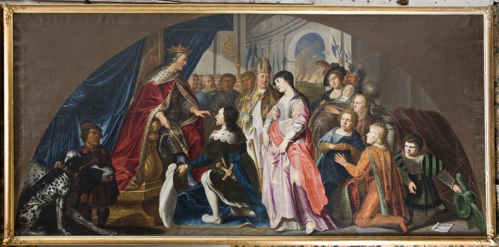 Keywords: Kung Harald Klak kommer till Kejsaren Ludvig år 826. Isaac Isacsz. Måleri. Historiebild - Skoklosters slott - 85995.tif Till v sitter på tronen kejsaren iförd blå guldstickad dräkt hermelinsbrämad mantel öppen krona spira i handen vid sidan av tronen dvärg med två dalmatinerhundar Framför kejsaren knäböjer konungen grön hermelinbrämad dräkt blått bälte svärd m guldfäste I mitten biskop med stav och mitra gemålen rödgul dräkt rött skärp tunt dok t h barnen i bakgrunden hovfolk och soldater fönsterutsikt mot brinnande stad <br/>Duken rektangulär målat halvcirkelfält varav den största delen upptas av ett trepassformigt fält med tjockare målning och klarare färger ommålat under 1600- talet Krigsbyte av Wrangel på Kronborg 6 sept 1658 <br/>Kilad spännram Under spännramen förstärkning av papp makulatur samt ett eller möjligen två handskrifter på latin <br/>Förgylld prydnadsram av furu enkel hörndekor av förgyllt bly Varje ramdel märkt med rödkrita No 3 Ramlistens bredd 70 mm <br/>Signerad Isaac Isacsen Fecit A o 1640 <br/>Suttit i ett tak på Kronborg original caption Kung Harald Klak kommer till Kejsaren Ludvig år 826 Isaac Isacsz Måleri Historiebild <br/> Nyckelord Isacsz Målning Barocken Kejsaren Ludvig Föremålsbild 1640 oil on canvas size mm 1631 3450 SKO Carl Gustaf Wrangel place of origin original filename sm_dig4012 23240 inventory number SKO 1954 85995 PD Jens Mohr Jens Mohr History paintings Media contributed by LSH unmatched objKeyword Media contributed by LSH unmatched creator Media contributed by LSH unmatched keyword Media contributed by LSH 2013-10 |