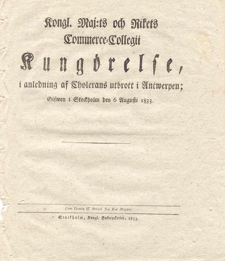 | Keywords: Kungörelse om kolerans utbrott 1833, bild 1.jpg sv Kungörelse från Kungliga Majestät och Kommerskollegium i Stockholm den 6 augusti 1833 i samband med kolerans utbrott i Antwerpen en A public notice anno 6th august 1833 from the staff of the swedish king who shall introduce restrictions because of Cholera epidemic in Antwerpen ru Общественное уведомление anno 6-ого августа 1833 от штата шведского ко оля кото ый должен ввести ог аничения из-за эпидемии Холе ы в Антве пене de Eine Bekanntheit anno 6 erhabener 1833 vom Personal des schwedischen Königs der Beschränkungen wegen der Cholera-Epidemie in Antwerpen einführen soll PD-old 1833-08-06 1833 in Sweden August 1833 in Europe Cholera |