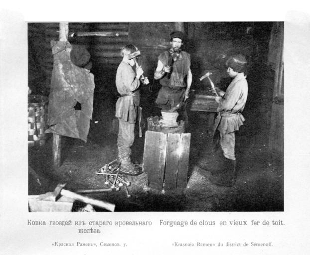 | Keywords: Kustari 018 Kovka gvozsdej.jpg en Handicraft Industry and Trades of Nizhegorodskaja gubernija Krasnaja Ramen XIX c ru Куста ные п омыслы и емёсла ижего одской губе нии Ковка гвоздей из ста ого к овельного железа Де евня К асная Рамень Семёновского уезда 1896 год Скани ован из книги ижего одская губе ния по исследованиям губе нского земства Выпуск II Куста ные п омыслы ижего одской губе нии / сост А Плотников СПб 1896 еизвестный фотог аф конца XIX века 1896 PD-old Handicraft Industry of Nizhny Novgorod province |