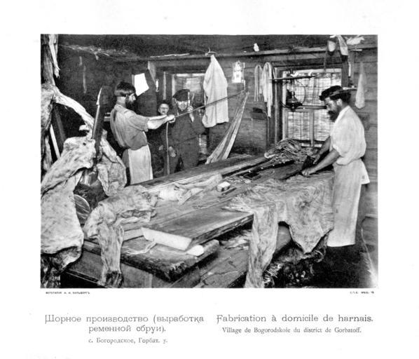 Keywords: Kustari 020 Shornoe proisvodstvo.jpg en Handicraft Industry and Trades of Nizhegorodskaja gubernija Bogorodsk XIX c ru Куста ные п омыслы и емёсла ижего одской губе нии Шо ное п оизводство выделка еменной сб уи Село Бого одское Го батовского уезда 1896 год Скани ован из книги ижего одская губе ния по исследованиям губе нского земства Выпуск II Куста ные п омыслы ижего одской губе нии / сост А Плотников СПб 1896 еизвестный фотог аф конца XIX века 1896 PD-old Handicraft Industry of Nizhny Novgorod province Horse harnesses in Russia