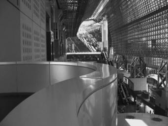 Keywords: Kyoto Station C0392.jpg This photo shows the interior of Kyoto Station in Kyoto Japan The architect is Hiroshi Hara The viewpoint is on about the fourth or fifth floor To the right is the interior of the facade on the north Karasuma Street side Pedestrians are exiting through an opening Ahead is the Grand Staircase a public space that can be used for exhibitions concerts and performances Scenes for television shows such as Kyoto Meikyū Annai have been recorded there Escalators to the right of the stairs lead from the ground floor to about the twelfth floor emerging from under the roof so that the top floor out of sight beyond the last escalator is exposed to the elements To the right of the escalators is the Isetan Department Store in the station building more of the same store flanks the staircase out of sight on the left Above the escalators at the top of the photo is a walkway that leads along the length of the interior of the station; it appears to be suspended from above Access to the railway platforms is at ground level out of sight below left 2006-12-28 own assumed Fg2 Other views <gallery> Image KyotoStation2871 jpg The Karasuma facade from inside looking north The Grand Stairway is to the left Image Kyotostation4 jpg A view looking down into the station from the top floor above the Grand Stairway Connecting corridors from the elevated walkway are visible beneath the curved roof sections The piers that support the facade lie just to the left of the JR sign that's below center at the right edge of the photo Image Kyoto Station interior long from mezzanine jpeg A view from the mezzanine level of the Grand Staircase looking to the opposite of the photo at top The shiny curved wall that forms the foreground of the photo at the top is visible here near the top on the right beyond the potted palm tree </gallery> I took the photo on December 28 2006 and contribute my rights in the file to the public domain Kyoto Station building 1997 Black and white photographs of buildings Black and white photographs of Japan |