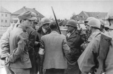 Keywords: Kz dachau liberation person.jpg en SS men conference with Gen Henning Linden during liberation of the dachau concentration camp Pictured from left to right SS aide camp leader Untersturmführer Heinrich Wicker mostly hidden by the aide Paul Levy a Belgian journalist person with helmet looking to his left Dr Victor Maurer back General Henning Linden person with helmet looking to his right and some US soldiers Picture is taken from the USHMM de SS-Soldaten und General Henning Linden während der à bergabe in Folge der Befreiung des Konzentrationslagers Dachau durch die US-Arme 1945 Von links vorne SS-Helfer Lagerkommandant Untersturmführer Heinrich Wicker überwiegend verdeckt der belgische Journalist Paul Levy links neben Victor Mauerer mit dem Rücken zur Kamera Rechts davon General Henning Linden mit Netzhelm und andere Soldaten der US-Armee Fotografie USHMM United States Holocaust Memorial Museum PD-USGov Dachau liberation Dachau concentration camp in 1945 Images from the United States Holocaust Memorial Museum |