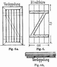 Keywords: L-Tuer2.png Lueger Lueger/Doors de A Aeußere Türen welche den Einflüssen des Wetters und der Feuchtigkeit ausgesetzt sind müssen von starkem Holze und ohne Leim zusammengesetzt sein In ihrer einfachsten Form werden sie vom Zimmermann erstellt Die rauhen oder gehobelten Bretter werden stumpf gefügt oder gespundet oder in Nut und Feder nebeneinander gesetzt und auf Querleisten mit Strebebug mittels Nägeln oder Schrauben befestigt Fig 6 Größere Türen und Torflügel erhalten noch Schlag- oder Wandsäulen mit mehreren Riegeln und Bügen Aehnlich sind auch große Kirchentüren mit mehreren Strebebügen zu bilden Als Vorbild können hierfür die Türen der St -Chapelle in Paris gelten 4 Soll die Türe zur Abhaltung von Kälte und Hitze dienen oder die Ausgleichung der Außen- und Innentemperatur verhindern so genügt eine einfache Brettdicke nicht; es wird die Türe sich werfen Die einfachste Verstärkung bilden aufgesetzte Friese in weiten oder engen Feldern die bis zu einer Ausschmückung der Außenfläche sich entwickeln lassen Besser dient die Verdoppelung eine zweite Brettlage welche auf die Blindtüre aufgenagelt wird Dies kann in senkrechter Fig 6a und 6b wagerechter mit Ueberfälzung Fig 7 oder schräger Richtung verstrebend geschehen Als beste aber gilt die gestemmte Türe aus Rahmwerk mit Füllungen bestehend wobei die Rahmen oder Friese durch Schlitzzapfen miteinander verbunden und an ihren Kanten mit Hobel oder Profil versehen sind entweder glatt in Fasen mit Kehl- oder Karniesprofil Fig 8 a b c welche je nach der Stärke eine einfachere oder reichere Wirkung zeigen “ Die Füllungen ob glatt oder abgeplattet sind 5 a eingestemmt s Bd 3 S 239 in eine Nut zwischen den Profilen des Frieses b in den Falz gelegt mit aufgesetztem Kehlstoß Fig 9 oder bei sehr starken Rahmen und Füllungen c überschoben Fig 10 Die Einteilung erfolgt in quadratischen oder länglichviereckigen Feldern oder aber mit durchbrochenen vergitterten und verglasten Oeffnungen im oberen Teile zur Erhellung des Innern Da über eine Höhe von 3 0 m die Flügel sich verziehen ist bei größerer Höhe ein Oberlicht s Bd 6 S 727 anzubringen und für den oberen Anschlag des Türflügels ein Kämpferholz s Latteibrett Bd 6 S 74 Vorteilhaft ist es die gestemmten Türen tief in Nischen hineinzulegen um sie den Einflüssen des Regens und der Feuchtigkeit zu entziehen B Innere Türen werden unter Anwendung des Leims erstellt In einfachster Gestaltung erscheint sie als 1 Glatte Türe mit Querleisten Hierbei sind jedoch die Bretter in ganzer Breite zu einer Tafel Fig 11 verleimt und die Querleisten 1 cm tief auf den Grat Schwalbenschwanz in die Tafel eingeschoben s Einschieben Bd 3 S 244 um diese gegen Werfen zu schützen; beim Schwinden werden die der Länge nach keilförmig gestalteten Leisten nachgetrieben Fig 11 Das Verleimen der Tafel erfolgt mittels Zwingen Fig 12 und 13 2 Gestemmte Türen bestehen wie A aus Friesen und Füllungen; die letzteren sind durch Mittel- und Querfriese getrennt und man unterscheidet nach deren Zahl Zwei- Drei- bis Sechsfüllungstüren Die Friese sind 25 “45 mm stark und 14 “20 cm breit durch Schlitzzapfen unter sich verbunden und haben seitlich Nuten für die mit einer Feder eingreifenden 20 “25 mm starken Füllungen sowie Kehlstöße s oben welche die tieferliegenden Felder umfassen Dabei sind die Nuten so tief zu halten daß die Füllung Spielraum zur Ausdehnung hat; damit aber diese letztere nicht zu groß werde sollte die Füllungsbreite nicht mehr als einfache Brettbreite d i 25 “30 cm betragen In reicher Arbeit können die Füllungen geschnitzt oder mit eingelegter Arbeit Intarsia versehen werden Während einflügelige Türen ihren Anschlag ringsum in dem Türfalz s oben finden ist bei zweiflügeligen für einen solchen in der Mitte zu sorgen Hierzu dient eine Ueberfälzung oder Schlagleisten Fig 14 welche beiderseitig anzubringen sind Bei schmalen zweiflügeligen Türen von 1 30 m Lexikon Türen Lueger Lexikon der gesamten Technik S 38960 vgl Lueger Bd 8 S 642 ff |