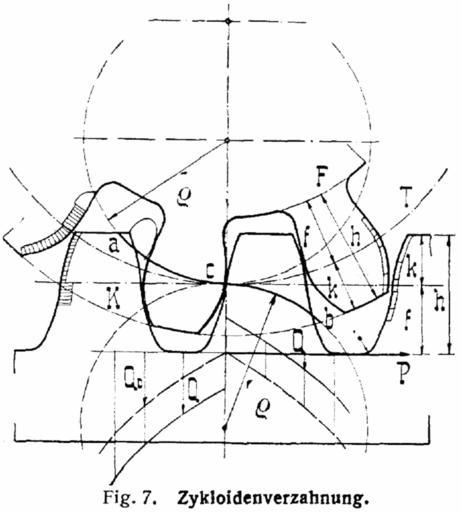 Keywords: L-Verzahnung5.png de Die Zykloidenverzahnung Fig 7 hat nach Bd 2 S 486 eine aus zwei Kreisbogen bestehende Eingrifflinie nämlich die Rollkreise die außerhalb und innerhalb auf dem Teilkreise abrollend mit einem ihrer Punkte die Zykloiden beschreiben Zur Aufzeichnung 6 trägt man gleiche nicht zu große Strecken auf Teilkreis und Rollkreis vom Berührungspunkte c aus mehrmals ab und schlägt mit der Entfernung des Punktes c von einem Teilpunkte des Rollkreises einen Bogen um den zugehörigen Teilpunkt des Teilkreises; die Umhüllende der Kreisbögen ist eine Epizykloide außerhalb und eine Hypozykloide innerhalb des Teilkreises an der Zahnstange Fig 7 eine Orthozykloide oberhalb und unterhalb des Teilriffes Die Eingriffstrecke a c b wird durch die Kopfkreise begrenzt Der Eingriffbogen auf dem Teilkreise ist gleich groß Die Eingriffdauer als das Verhältnis von a c b zur Teilung muß größer als 1 sein Die Fußkurven die sich mit dem Abrundungsradius von 0 1 t an den Fußkreis anschließen kommen nur so weit zum Angriff wie die Punkte a und b innerhalb der Teilkreise liegen In Fig 7 sind rechts die auf je 1/4 t angreifenden Strecken der Zahnkurven abgeteilt links ist die für 16 auf 48 Zähne berechnete Abnutzungscharakteristik 4 angetragen und das von der Kopfhäute im Fuß des Gegenzahnes allmählich auszuschabende Stück angedeutet Der Normaldruck fällt während der Berührung in der Zentralen gerade in die Umfangsrichtung bei a und b in die Richtung a c b Dementsprechend steigt der Seitendruck Q0 von Null in der Zentralen nach vorn und hinten an; mit Einrechnung der Reibung für m 0 2 erhöht sich der Seitendruck Q im Punkte a auf 0 7 P und verursacht beim Durchgang durch die Zentrale einen Druckwechsel Hiernach verläuft die Kraftübertragung nicht so sanft wie man gewöhnlich annimmt Die Räder müssen um richtig zu arbeiten genau auf Berührung der Teilkreise eingestellt werden Gegenüber den Evolventen bleibt als Vorteil nur der die Abnutzung mildernde Umstand der Anschmiegung erhabener und hohler Flanken Für Satzräder wählt man den Radius der Rollkreise je zu s 7/8 t oder 2 75 t die Kopfhöhe k 0 3 t oder 1 0 t die Fußhöhe f 0 4 t oder 7/6 t auch bis 5/4 t Für Einzelräder nimmt man wohl den einen oder andern Rollkreis größer an zur Erhöhung der Eingriffdauer wobei allerdings das nutzbare Stück der Zahnfußkurve kürzer ausfällt Wenn der Rollkreis gerade halb so groß wie der Teilkreis ist wird die Fußkurve eine radiale gerade Linie; zweckmäßig benutzt man für Uhrwerkräder und Holzzähne Bd 5 S 113 und 128 zur Vermeidung der radialen Unterschneidung der Zahnfüße als Zahnkurven Aequidistanten als Geradflankenverzahnung Bd 4 S 396 Wenn der Rollkreis gleich dem Teilkreis ist bleibt der sonst die Fußkurve beschreibende Punkt im Teilkreise liegen und gleitet längs des Teilkreisbogens als Eingrifflinie an der Kopfkurve des Gegenzahnes als Punktverzahnung Bd 7 S 297 Mit Aequidistanten im Abstande der halben Zahnstärke erhält man für den Punkt einen Kreis s Triebstockverzahnung Für eine Zahnstange mit Triebstöcken beschreibt die Triebstockmitte als Punkt auf dem geraden Teilriß als Rollkreis statt der Zykloide eine Evolvente auf dem Teilkreise des Rades und für eine auflaufende Gelenkkette Bd 5 S 459 einen Kreisbogen Eine gemischte Verzahnung mit Zykloiden als treibenden Flanken und Evolventen mit ß 53° nämlich sin ß 0 8 als Rückenflanken bildet die Daumenverzahnung Bd 2 S 677 ; s a Hebedaumen Bd 5 S 1 Lexikon Verzahnungen Lueger Lexikon der gesamten Technik S 39712 vgl Lueger Bd 8 S 793 ff Lueger Lueger/Machine elements Drawings of gears and gearboxes |