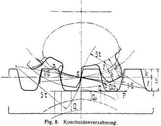 Keywords: L-Verzahnung6.png de Konchoidenverzahnung Fig 8 mit Konchoiden als Eingrifflinie ist als ein zwischen Evolventen- und Zykloidenverzahnung vermittelndes System vorgeschlagen 3 bestimmt durch kreisbogenförmige Kopf- und Fußkurven für die Zähne der Zahnstange vom Radius 5 t deren Mittelpunkte auf einer mit der Neigung 1 6 durch den Teilriß gehenden Geraden liegen Die nach Fig 1 zu entwickelnden Radzahnkurven schmiegen sich erhaben und hohl aneinander und gehen schräg durch die Teilkreise die beim Einbau der Räder auf Berührung einzustellen sind Die Seitendrucke halten günstige Mittelwerte zwischen denen der andern Systeme ein ebenso die Abnutzungscharakteristik deren Höchstwerte berechnet für 16 auf 48 Zähne 4 sich für Zykloiden Konchoiden und Evolventen wie 2 6 6 8 verhalten Für die Zahnhöhen sind in 3 mit Rücksicht auf Fettigkeit im allgemeinen niedrige Werte in Vorschlag gebracht doch kann man für Konchoidensatzräder bis herab zu neun Zähnen die sonst üblichen Maße ohne weiteres anwenden Triebe von vier bis acht Zähnen sind besonders auszubilden Lexikon Verzahnungen Lueger Lexikon der gesamten Technik S 39715 vgl Lueger Bd 8 S 794 Lueger Lueger/Machine elements Drawings of gears and gearboxes |