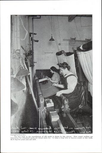 Keywords: LA2-NSRW-4-0290.jpg Copyright by Brown Bros The last stage in the manufacture of silk goods is shown in this picture Here expert workers are examining the completed goods for thread ends etc It takes a long time to become expert in this work as it requires great care and skill Image Manufacture of silk goods jpg NSRW original see below LA2-NSRW |