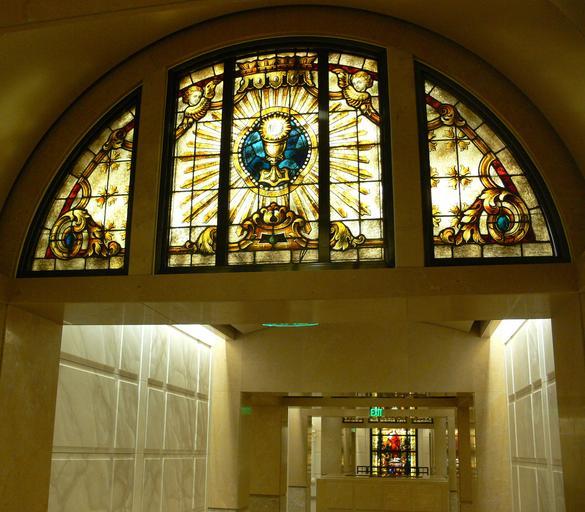 | Keywords: LA Cathedral Mausoleum Lunette Chalice.jpg Stained glass windows in the Mausoleum of the Roman Catholic Cathedral of Our Lady of the Angels Los Angeles California; originally created in the 1920s for Saint Vibiana Cathedral Los Angeles<br /> Lunette window depicting a chalice as a symbol of the Eucharist own own photograph Window early 1920s Photo October 2008 Window workshop of Franz Borgias Mayer 1848 “1926 ; Photo Andreas Praefcke Own work all rights released Public domain Stained glass windows in the Mausoleum of the Cathedral of Our Lady of the Angels Los Angeles Eucharist on stained glass windows Chalices on stained glass windows Lunettes in the United States Photos by User AndreasPraefcke |