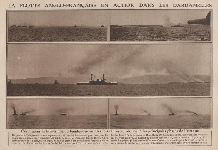 | Keywords: La flotte alliee en action dans les Dardanelles en 1915.jpg fr Cinq photographies montrant la flotte anglo-française en action dans le détroit des Dardanelles en 1915 Publiées par l'hebdomadaire Le Miroir du 18 avril 1915 en Rough translation Five instantaneous photographs taken during the bombing of Turkish forts and summarizing the main phases of the attack Number 1 top left A flotilla of minesweepers to allow warships to advance towards the Dardanelles Towards the center of the photo a spray of water produced by the explosion of a mine can be distinguished No 2 top right The destruction of forts Seddul Bahr seen from a British battleship No 3 center The bombardment of the fortress of Kum Kale We perceive right smoke rises from the fortifications Battleship in the foreground is HMS Queen Elizabeth ; left there are two French ships No 4 Part of the squadron moves towards the coast to shoot the fortifications ; ships left are French No 5 The same ships away after bombarding the coast Published by the weekly The Mirror of 18 April 1915 tr Kaba bir çeviriyle Beş anlık fotoğraf Türk kalelerin bombalanması sırasında çekilen ve saldırının ana aşamalarını özetleme No 1 sol üst savaş gemileri Çanakkale'ye doğru ilerlemek için izin mayın tarama gemisi bir filo Fotoğrafın merkezine doğru bir mayının patlaması tarafından üretilen su bir sprey ayırt edilebilir No 2 sağ üst Bir İngiliz savaş gemisi görüldüğü kale Seddul Bahr imha No 3 merkez Kum Kale kale bombardımanı Biz hemen duman surlarının yükselir algılarlar Ön planda Battleship HMS Queen Elizabeth; Sol iki Fransız gemileri vardır 4 numara birliğin Bölüm tahkimatı ateş kıyıya doğru hareket eder; Kalan gemiler Fransız vardır Sayı 5 uzak kıyıları bombardıman sonra aynı gemi 18 Nisan 1915 Yayınlandı 1915 http //gallica bnf fr/ark /12148/cb40360453x/date1915 r Alexandrie langEN Gallica fr author anonymous-EU PD-US-1923 Uploaded with UploadWizard Naval operations in the Dardanelles Campaign Battle of Gallipoli Naval warfare of World War I Le Miroir |
