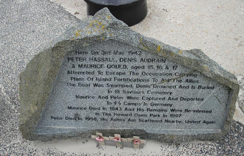 | Keywords: La Motte Jèrri 1942 monument Hassall Audrain Gould.jpg Saint Cliément Jèrri 4 d'Août 2009 Saint-Clément Jersey 4 août 2009 Saint Clement Jersey 4 August 2009 - Here on 3rd May 1942 Peter Hassall Denis Audrain Maurice Gould aged 15 16 17 attempted to escape the Occupation carrying plans of the island fortifications to aid The Allies The boat was swamped Denis drowned and is buried in St Saviour's Cemetery Maurice and Peter were captured and deported to SS camps in Germany Maurice died in 1943 and his remains were re-interred in the Howard Davis Park in 1997 Peter died in 1998 his ashes are scattered nearby United again own own photo 4 d'Août 2009 Man vyi Own work all rights released Public domain Coasts of Saint Clement Jersey Saint Clement Jersey War memorials in Jersey Monuments and memorials to victims of drowning Plaques referencing 1942 3 May Jersey resistance during World War II Survivors of Nazi concentration camps Victims of Nazi concentration camps 2009 in Saint Clement Jersey 1942 in Jersey |