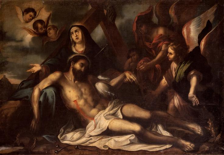 Keywords: La Piedad, anónimo del siglo XVIII (Ayuntamiento de Sevilla).jpg La obra representa a Jesucristo muerto y descansando en los brazos de su madre la Virgen María que aparece acompañada de ángeles llorando desconsoladamente y con la mirada puesta en el cielo Además este lienzo se basa en un grabado de Lucas Vosterman que a su vez se inspira en un lienzo del pintor holandés Anton van Dyck Primera mitad del siglo XVIII oil on canvas Size cm 221 158 Institution Ayuntamiento de Sevilla Escalera de la Institution Casa consistorial de Sevilla http //patrimoniumhispalense com/es/espacio/casa-consistorial/piedad-anonimo accession number http //patrimoniumhispalense com/es/espacio/casa-consistorial/piedad-anonimo PD-old-100 Paintings of the Pietà in Spain 18th-century paintings of the Pietà Works after paintings by Anthony van Dyck Religious paintings in the Ayuntamiento de Sevilla |