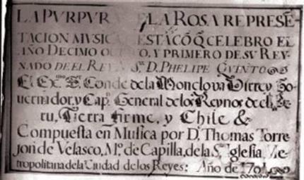 Keywords: La Púrpura de la Rosa.jpg Manuscrito original de La Púrpura de la Rosa 1701 http //www bibnal edu ar/protopais/mat/MyDFC 1 htm 2007-09-21 Tomás de Torrejón y Velasco Sánchez PD-old Check categories 2009 May 1 es wikipedia Villarrobledo es wikipedia Tomás_de_Torrejón_y_Velasco es wikipedia La_púrpura_de_la_rosa America Villarrobledo 8 Villarrobledo 1701 1728 deaths Composers from Spain Culture of Peru Baroque composers 1644 births Opera composers |