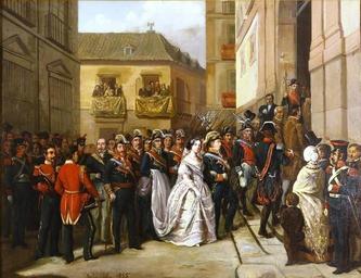 Keywords: La reina Isabel II y su esposo, visitando el monumento de Jueves Santo en la iglesia de Santa María (Museo de Historia de Madrid).jpg La obra representa a la reina Isabel II de España 1830-1904 y a su esposo el rey Francisco de Asís de Borbón 1822-1902 visitando el monumento del Jueves Santo en la desaparecida iglesia de Santa María de Madrid que fue demolida en 1868 1855 oil on canvas Size cm 89 72 Institution Museo de Historia de Madrid http //ceres mcu es/pages/Main accession number 00003 283 http //ceres mcu es/pages/Main PD-old-100 Portrait paintings of Isabella II of Spain Portrait paintings of Francis of Assisi of Bourbon Ramón Soldevila y Trepat 19th-century paintings in the Museo de Historia de Madrid 1855 paintings in Spain