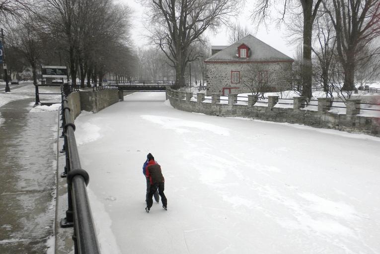 Keywords: lachine canal canada couple skating frozen water buildings winter snow ice nature outside trees