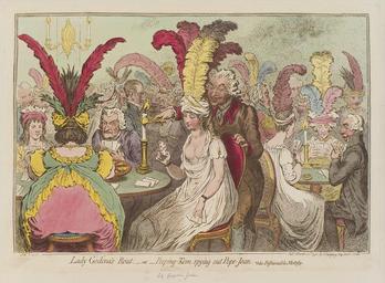 Keywords: Lady Godina's rout; - or - Peeping-Tom spying out Pope-Joan by James Gillray.jpg Lady Godina's rout; - or - Peeping-Tom spying out Pope-Joan by James Gillray died 1815 published 1796 See source website for additional information According to the National Portrait Gallery of the UK the caricature refers to Lady Georgiana Gordon 1781 “1853 Duchess of Bedford from 1803 until her death; the title and the lecherous servant refer to Lady Godiva Pope-Joan is a card game; Lady Godina is holding the diamond nine which is called the Pope in that game The man sitting on Lady Godina 's right is John Sneyd 1763 “1835 ; the fat woman sitting on her left is Albinia Countess of Buckinghamshire died 1816 The fashion of women wearing vertical feathers or plumes in their head-dresses is abundantly satirized This set of images was gathered by User Dcoetzee from the National Portrait Gallery London website using a special tool All images in this batch have been confirmed as author died before 1939 according to the official death date listed by the NPG D12561 1796 James Gillray died 1815 File Lady-Godinas-Route-Gillray jpeg PD-old-100 1796 cartoons National Portrait Gallery London James Gillray Peeping Tom character caricatures of fashion |