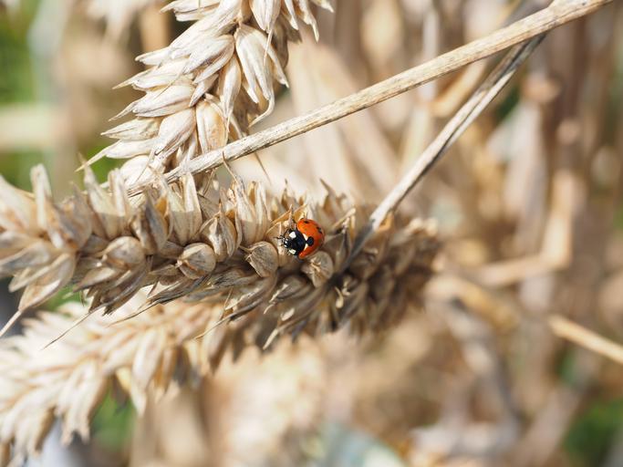 Keywords: ladybug beetle siebenpunkt coccinella septempunctata coccinella animal insect red spotted pest exterminator pest control wheat spike cereals grain field wheat field cornfield plant eat food arable agriculture agricultural cultivation nature triticum aestivum corn ear ear of corn halm ripe land rural golden season straw summer yellow harvest triticum poaceae grass