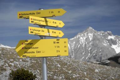 | Keywords: Lafatscher Joch.JPG Am Lafatscher Joch im Karwendel im Hintergrund die Sonnenspitze own 2011-05-07 Haneburger 47 342763 11 470757 region AT_heading N Images by Haneburger Hinterautal-Vomper-Kette Fingerposts in Austria Gleirsch-Halltal-Kette Halltal Hiking and footpath signs in Tyrol state |