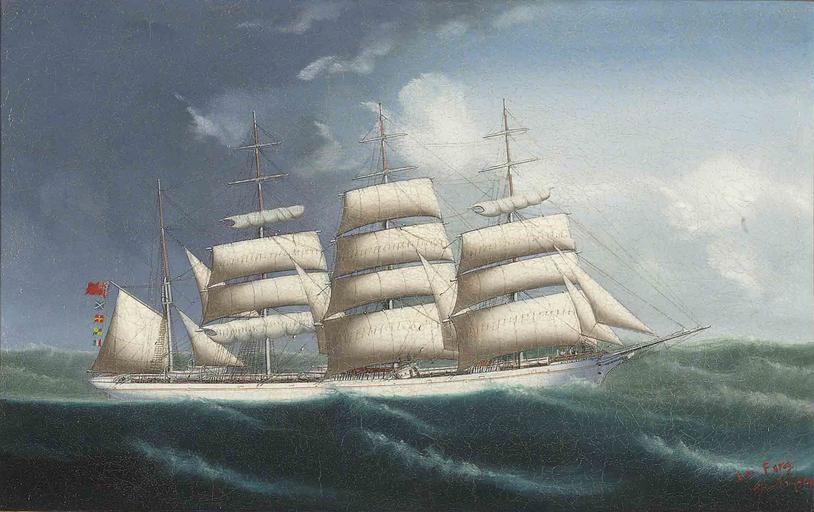 Keywords: Lai Fong - The Milton Stuart.jpg Lai Fong 1869 between 1892 1898 oil canvas cm 24 7 39 7 object history credit line signed and dated 1894 Built 1892 and put to the India trade accession number Christie's online 5527772 2659 358 New York 23 January 2012 PD-old-100 Lai Fong Milton Stuart ship 1892 19th-century sailing ships in paintings 1890s paintings 19th-century paintings location missing |