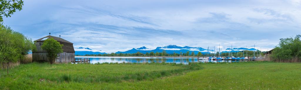 Keywords: lake bank hut boats log cabin alpine mountains water landscape nature idyllic chiemsee boat house rest waters anchorage fishing boats idyll