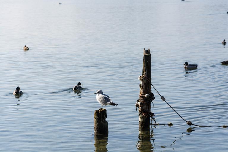Keywords: lake gmunden traunsee mirroring fog nature water quiet rest austria animals gull duck wooden posts post leash wave