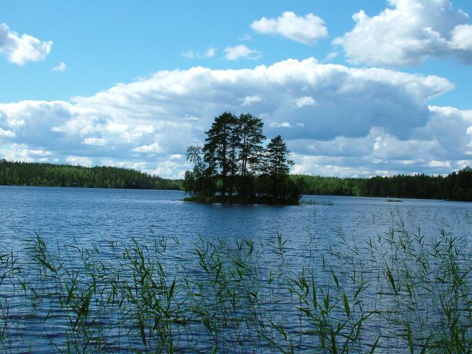 Keywords: lake island small trees finnish reeds sky clouds water