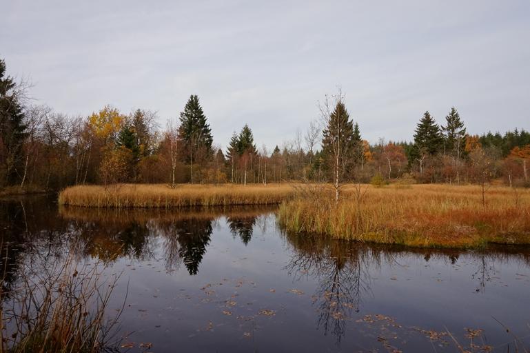 Keywords: lake moor forest palsen tree spruce fir nature reserve landscape sky autumn nature live grass meadow road coniferous forest crown pine ruflektion mirroring
