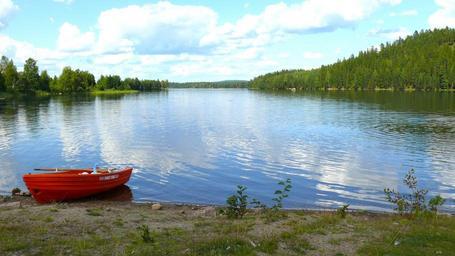 Keywords: lake saxen sweden water forest trees sky clouds boat reflections summer nature outside beautiful peaceful